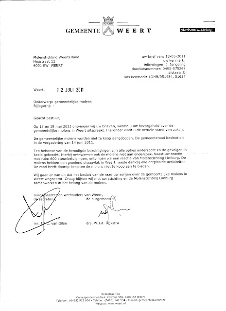 We hebben er even op moeten wachten, maar vandaag viel hij op de deurmat. De brief waarin het Weerter college van Burgemeester en wethouders officieel aan de Molenstichting Weerterland meedelen dat verkoop van de 4 gemeentelijke molens van de baan is.